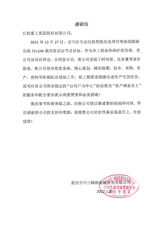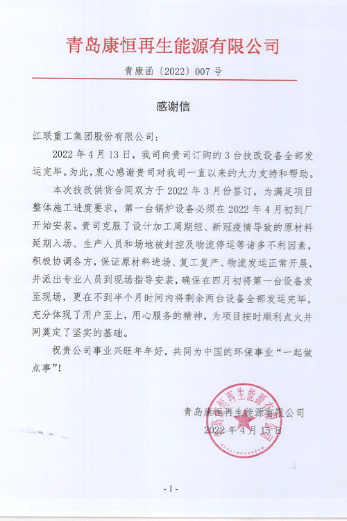 今年,公司收到两封来自业主重庆合川和青岛康恒的感谢信。信中业主对公司克服了“设计加工周期短、疫情导致的场地封控及物流停运”等诸多困难,全力满足客户需要给予了高度赞扬,对江联人全力以赴保履约和一心为业主服务的理念留下了良好的印象。